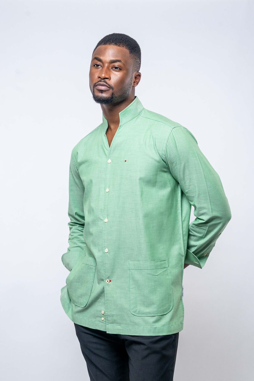 La coupe légèrement allongée et les deux poches plaquées à l’avant introduisent une dimension utilitaire maîtrisée, qui renforce son caractère sans alourdir la silhouette. Le vert, à la fois profond et lumineux, affirme une personnalité sûre d’elle.